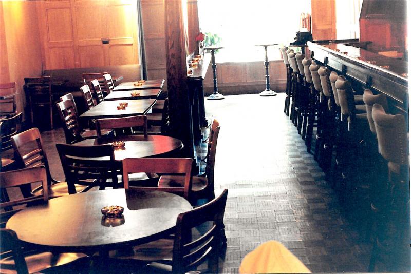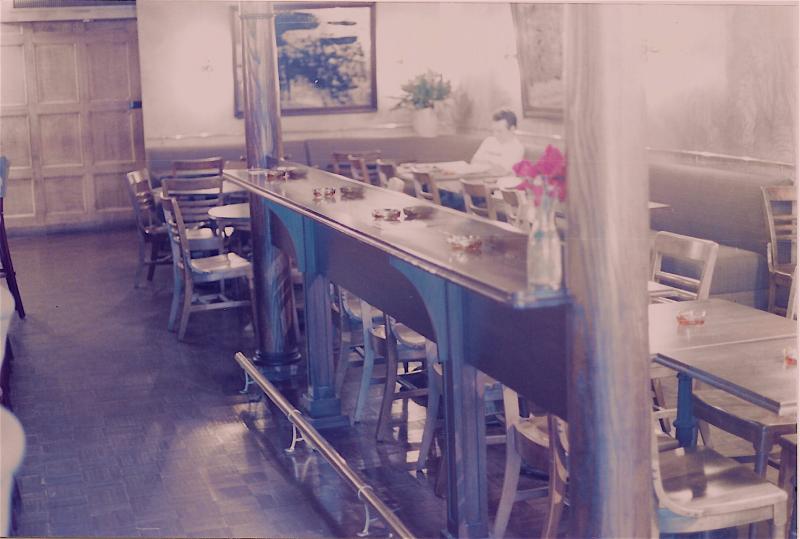 The bar rail, separating the dining space from the bar itself, was flanked by two wood columns that were illuminated on top.